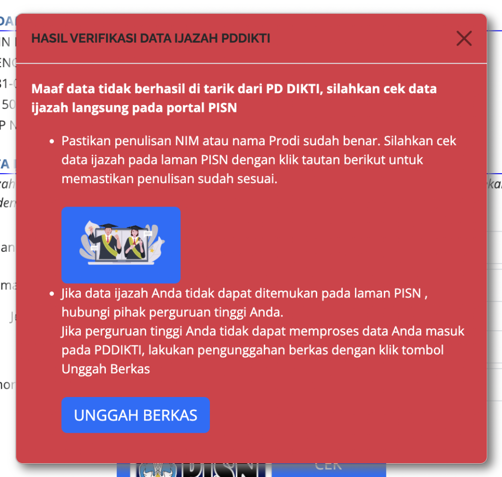 Informasi teknis error saat ini belum diketahui dan belum mendapatkan solusi dari pihak pengelola InfoGTK ataupun PISN. Berkaitan dengan hal ini, kewenangan kampus IAIN Manado hanya sampai di PDDIKTI dan PISN, tetapi TIPD selaku pengelola data IAIN Manado tidak lepas tangan terkait hal ini. Solusi sementara saat ini adalah mengunggah berkas manual pada halaman InfoGTK untuk mengejar deadline Verval.